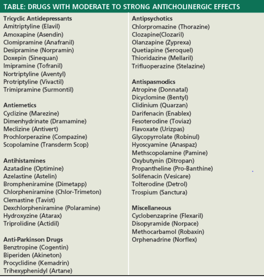 It was noted that the study was limited by the patient sample size and that only one third were taking this class of drugs. But the researchers added that other studies have found the number of adults taking anticholinergics is closer to 70%. While their findings point to possible issues with these types of medications, the authors recommend speaking with a doctor or pharmacist before suddenly stopping the use of any prescription anticholinergic medication.