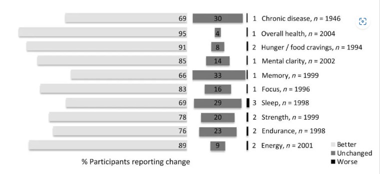 So here is the actual data from their study… The light grey is “Better,” the Gray is “Unchanged”, and the black is “Worse”. The percentage of reported improvements is staggering – no other diet can claim this degree of change. It is a 65-95% improvement on every parameter they measured. This does not include changes in labs (objectively measured, as we do in the office), or assessment of specific conditions such as autoimmunity, diabetes, irritable bowel syndrome, inflammatory bowel disease, obesity, migraines, and others that I have personally witnessed in my practice with dietary changes, but also from communication with other colleagues in functional and integrative medicine practices. I would like someone to explain objectively how this is a “Bad Thing”, without the plant-based, save-the-world spin.
